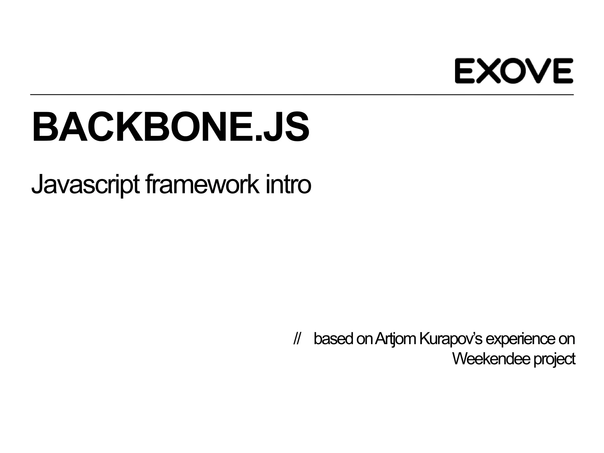 Backbone.js is a JavaScript framework that aims to solve issues with messy JavaScript code by implementing an MVC pattern and object-oriented principles, providing structure through core concepts like Models for data storage, Collections for grouping Models, and Views for rendering display logic, as well as a Router for navigation. It is lightweight at only 6kb and supports RESTful JSON APIs and event-driven programming.