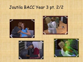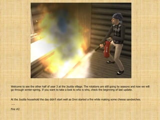 The document provides an update on the second half of year 3 in the Joutila village. It summarizes various events, including Onni starting multiple kitchen fires, Elmo beginning a relationship with Daniela and getting her pregnant on a trip, Hilda growing up and marrying Orlando, and Petri's wife Taika giving birth to twins after Petri was fired from his job.