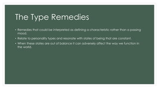 The document discusses Bach flower therapy and its type remedies, which are characterized by defining personality types rather than transient moods. It lists twelve specific flower remedies, each associated with distinct personality challenges, such as possessiveness, fear, and impatience. Additionally, the document provides resources for further information on the topic.