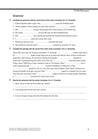 This document contains a practice test with questions about vocabulary, grammar, and rewriting sentences. The vocabulary questions involve choosing the correct word to complete sentences or replacing words to make sentences logical. The grammar questions involve completing sentences with the correct verb forms. There are also questions about rewriting sentences using different grammatical structures. The test contains multiple choice, fill-in-the-blank, and rewriting questions across three sections to assess English proficiency.
