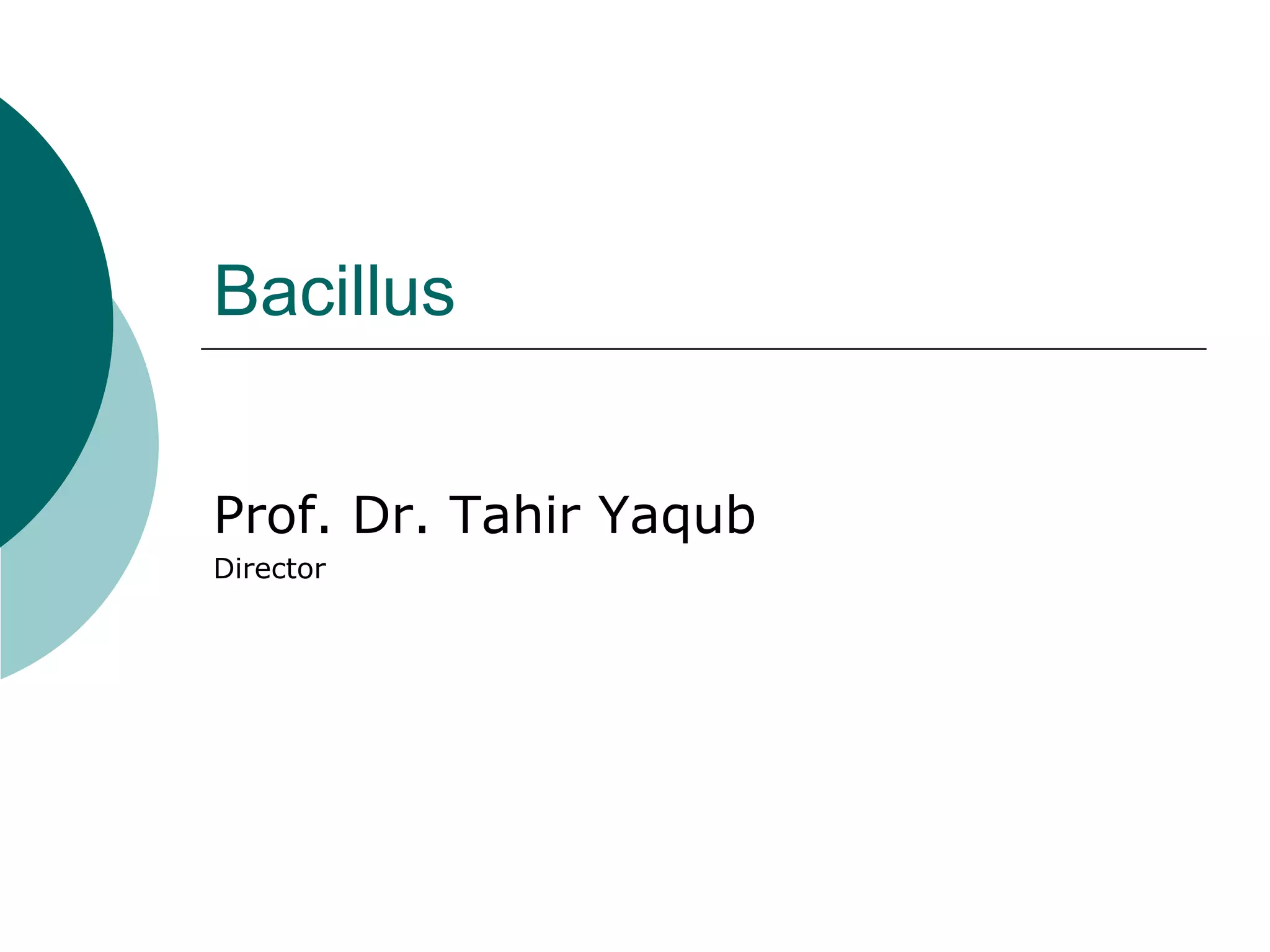 This document discusses Bacillus, a genus of gram-positive bacteria that can form endospores. It describes key characteristics of Bacillus, including that they are large, rod-shaped, and can be aerobic or facultative anaerobes. Several Bacillus species are highlighted, including B. anthracis, which causes anthrax, B. cereus which can cause food poisoning, and B. licheniformis which can cause abortions in cattle. The process of endospore formation is explained in detail, noting it allows Bacillus to survive harsh conditions. Clinical infections from different Bacillus species are also summarized.