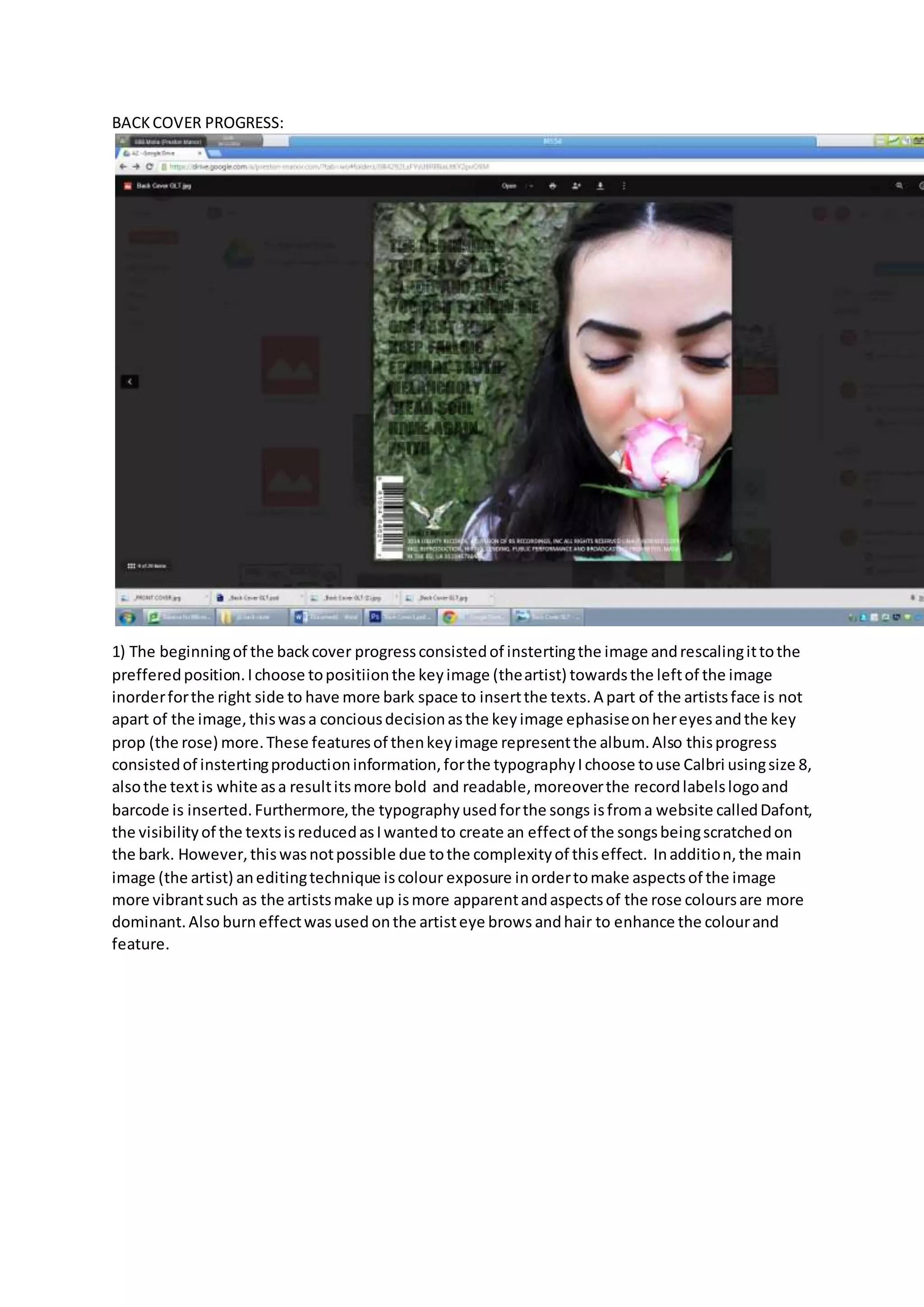 1) The back cover summary consisted of inserting the main image of the artist off-center to the left to allow more space for text on the right. Production information and song titles were added using different fonts and styles. Editing techniques like color exposure and burning were used to enhance features of the image.