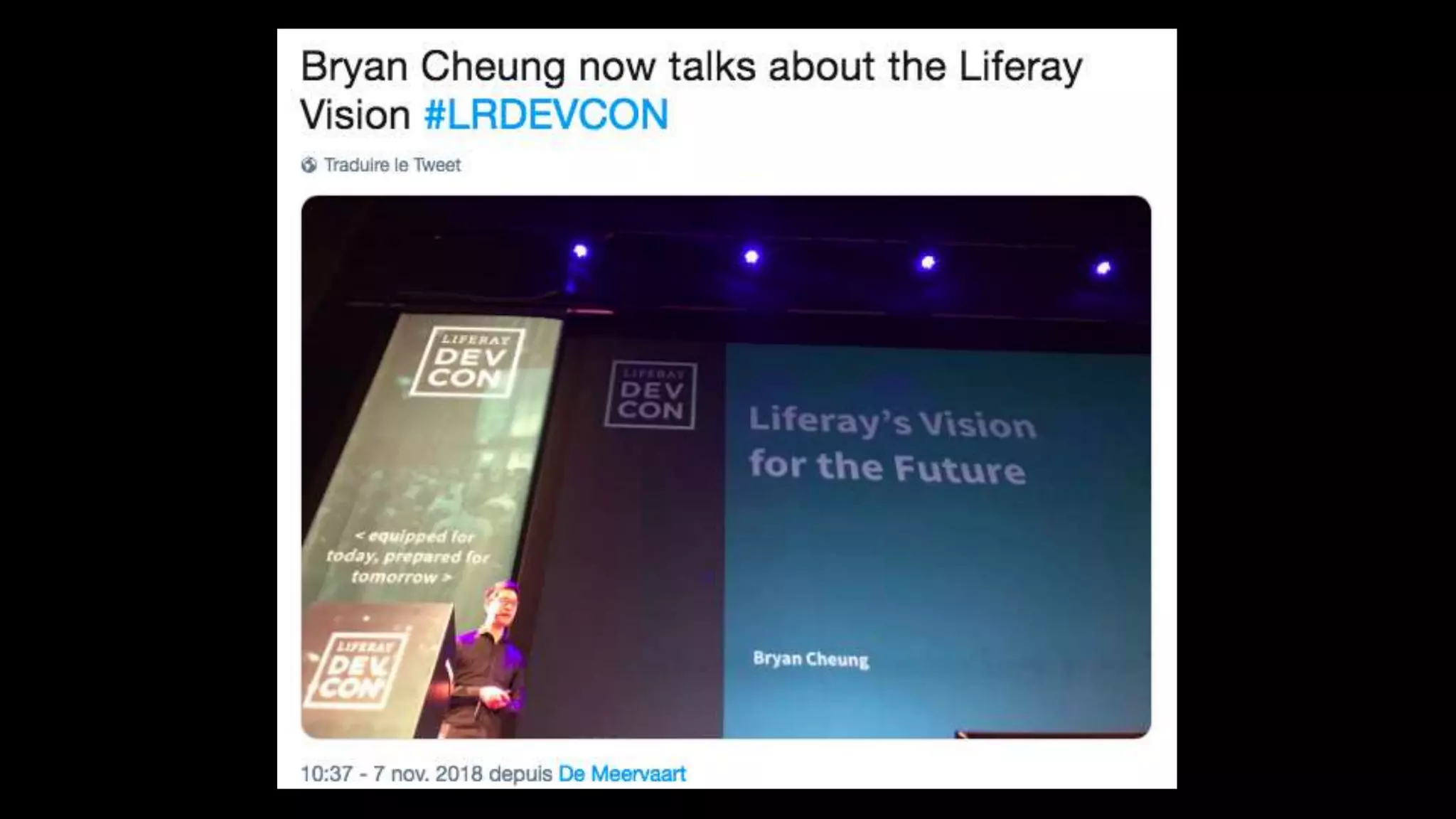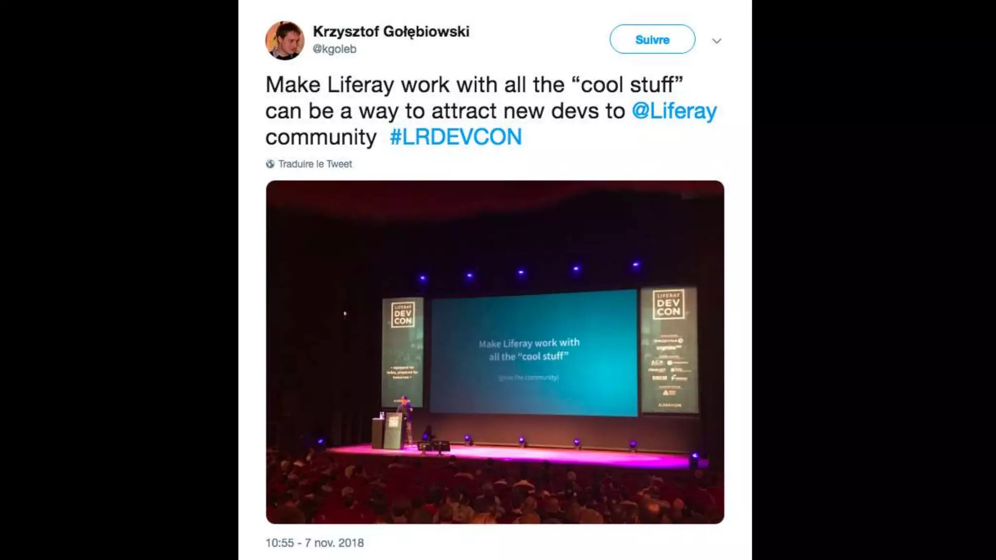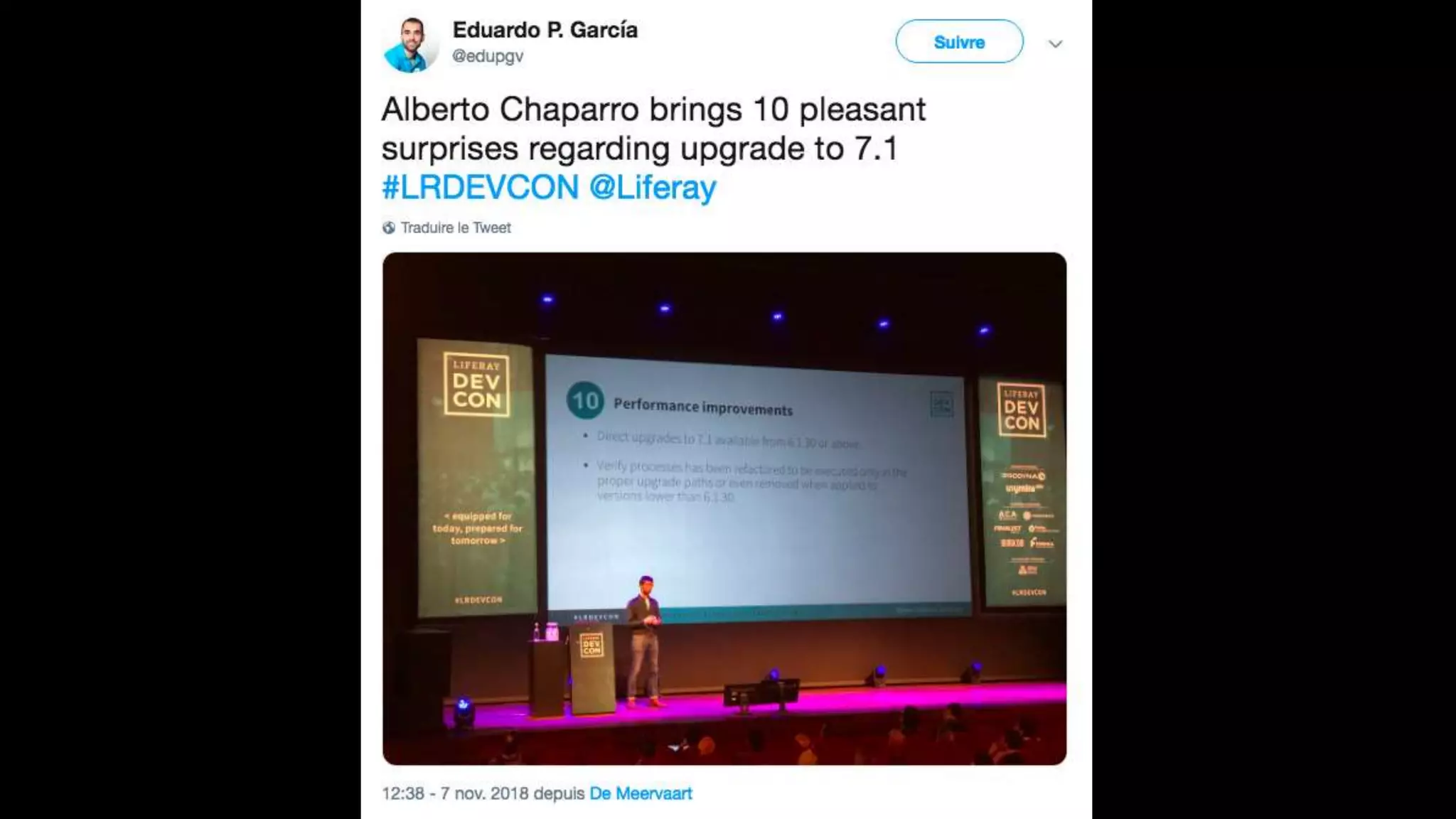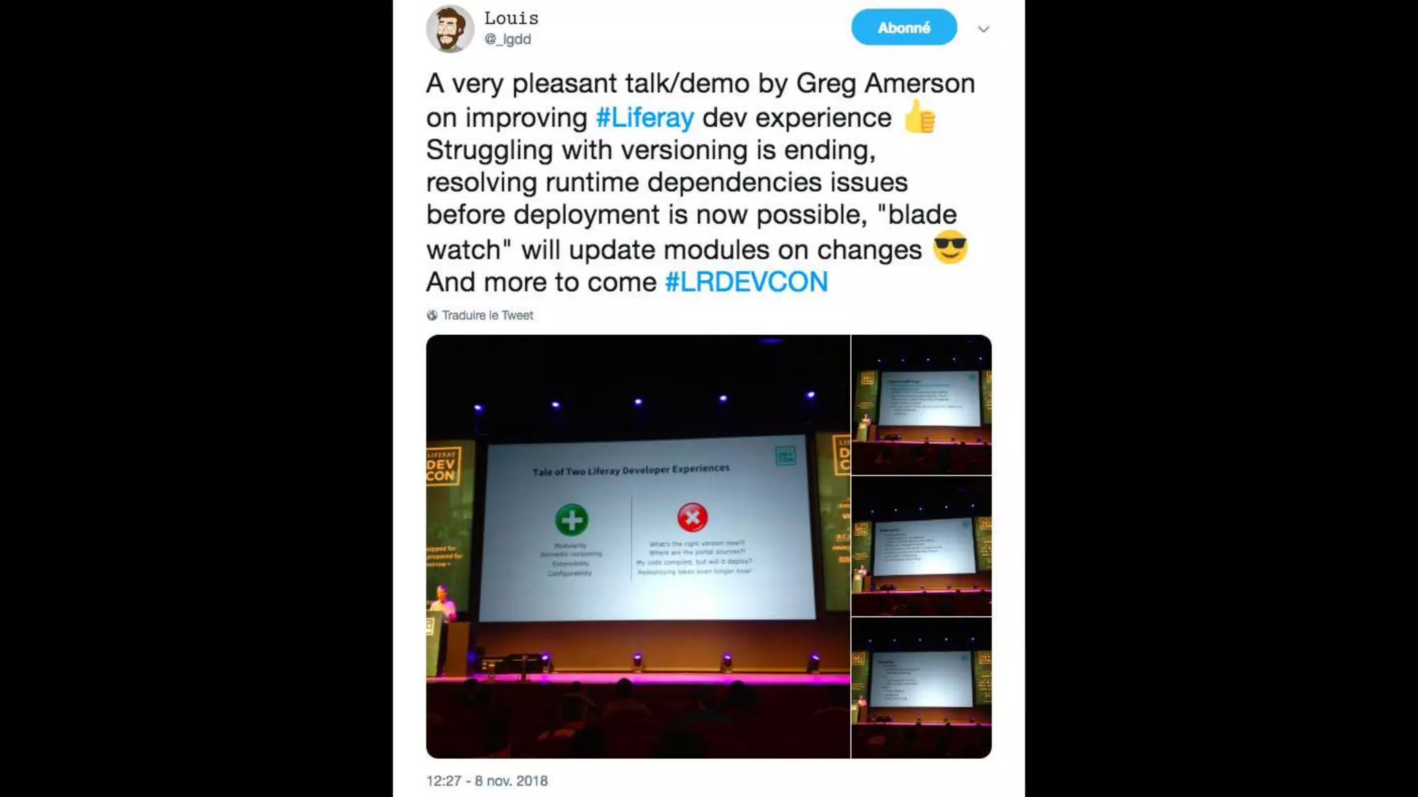 The document highlights the Liferay France User Group meetup #10 held in November 2018, detailing events from the unconference on November 6 and subsequent days. It includes links to impressions from the first day and resources for dependency visualization during the event. Additionally, it references the agenda available on Liferay's official site.