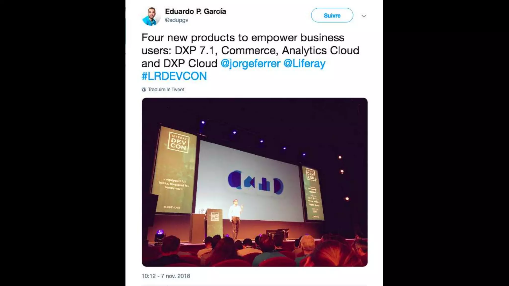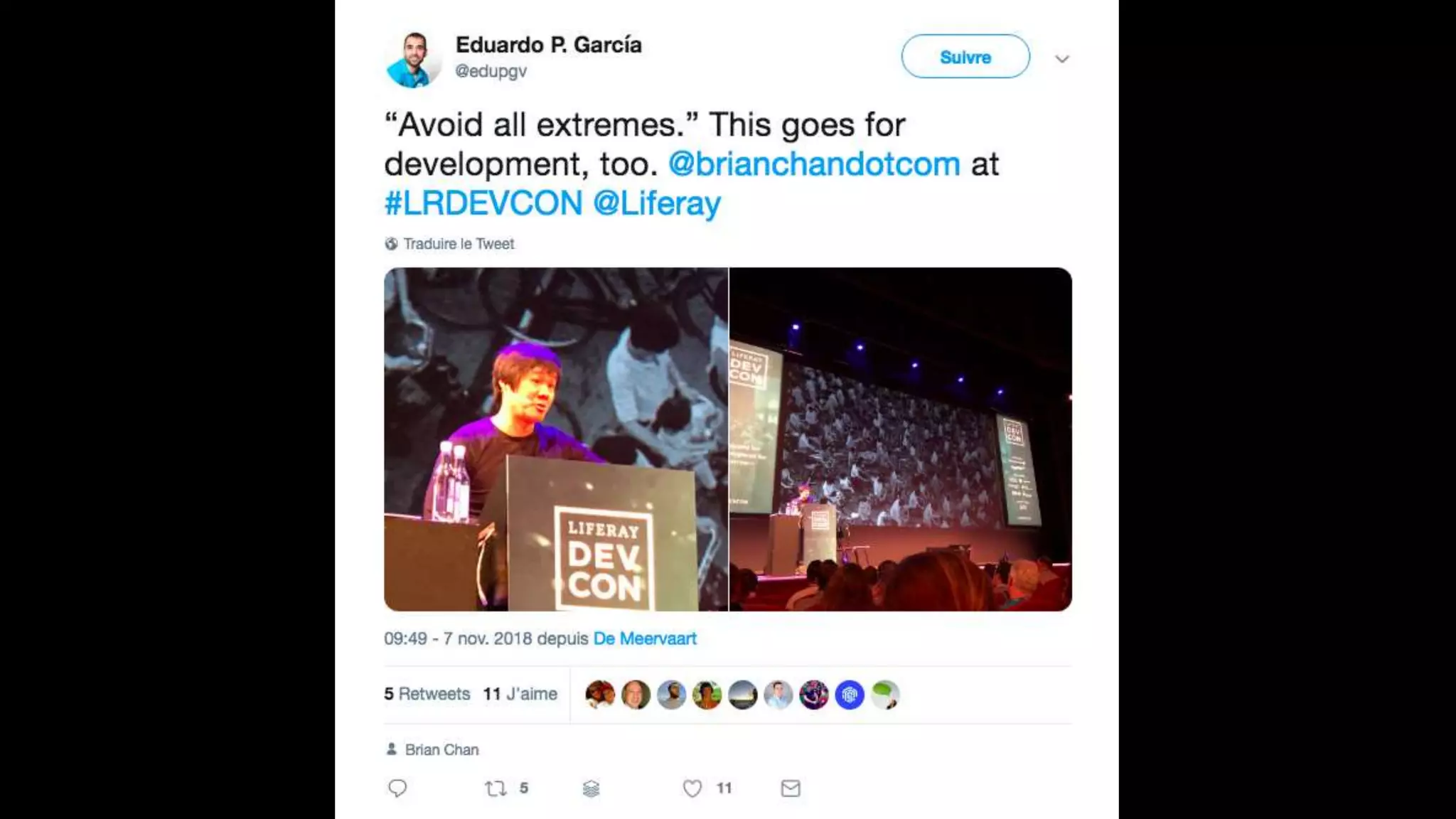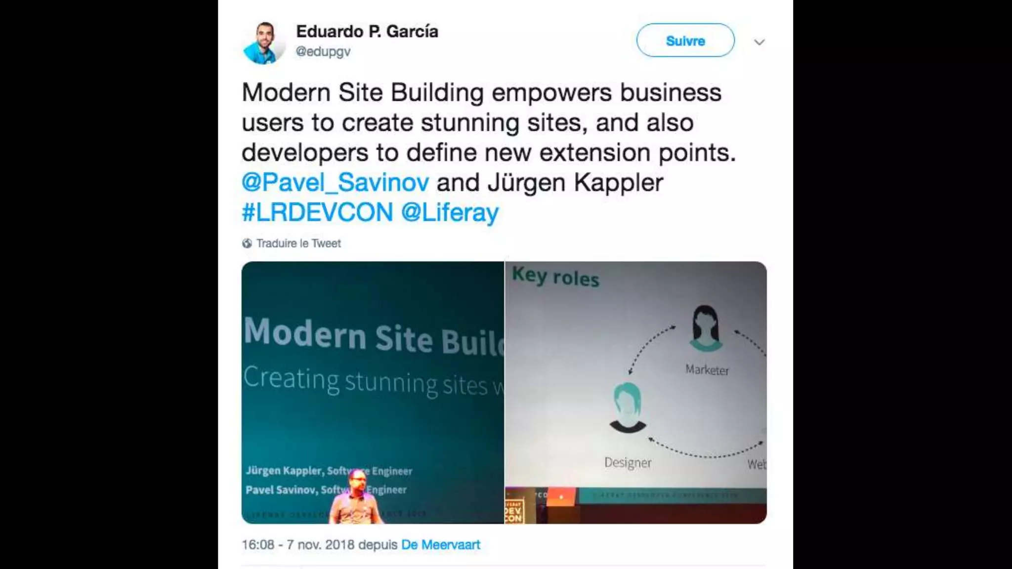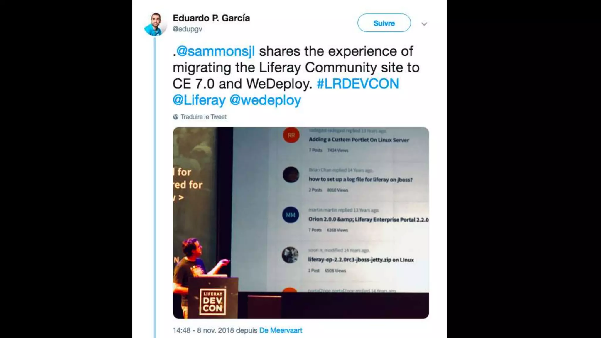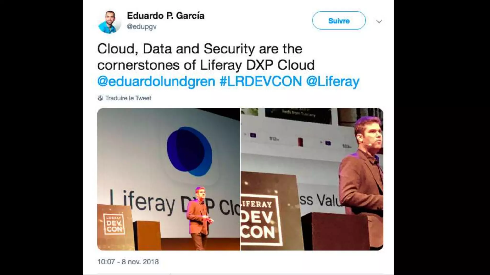 The document highlights the Liferay France User Group meetup #10 held in November 2018, detailing events from the unconference on November 6 and subsequent days. It includes links to impressions from the first day and resources for dependency visualization during the event. Additionally, it references the agenda available on Liferay's official site.