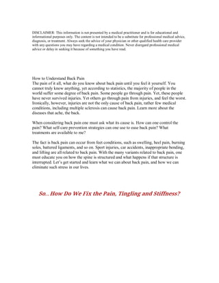 This document offers an extensive overview of back pain, its potential causes including injuries, medical conditions, and structural issues in the spine. It outlines symptoms, diagnostic approaches, and treatment options, emphasizing the importance of professional medical advice for managing back pain. Additionally, it discusses various management strategies and complications related to back pain and fractures.