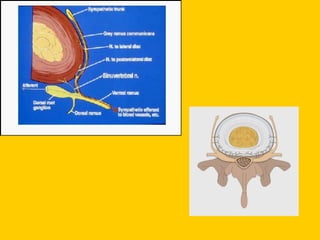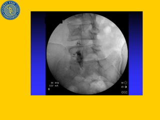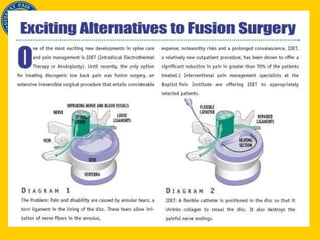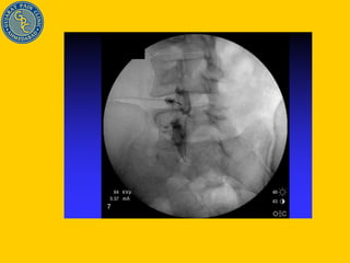 Dr. Shiraz Munshi discusses his approach to treating chronic back pain, which involves precision diagnosis through a combination of history, physical exam, imaging, and diagnostic injections to identify the specific source of pain in 70% of cases. This allows for targeted, minimally invasive treatments like nerve blocks, radiofrequency ablation, and spinal cord stimulation to effectively manage pain and improve outcomes like returning to work. The document outlines various potential sources of spinal pain and techniques for diagnosing and treating conditions of the discs, facet joints, sacroiliac joints, and nerves.
