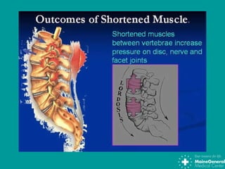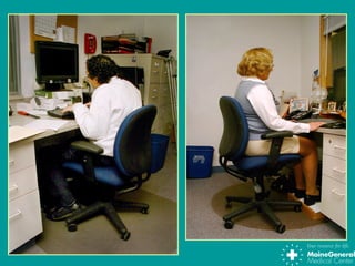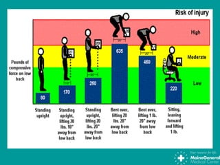 Back injuries are common, accounting for 1 in 5 workplace injuries. Lifting heavy objects, twisting, prolonged sitting or standing, and falls are common causes. The spine consists of vertebrae, discs, joints, ligaments and muscles that can be injured. Maintaining good posture and lifting techniques, exercising for back strength and flexibility, stretching, and being aware of ergonomic risks can help prevent back injuries.