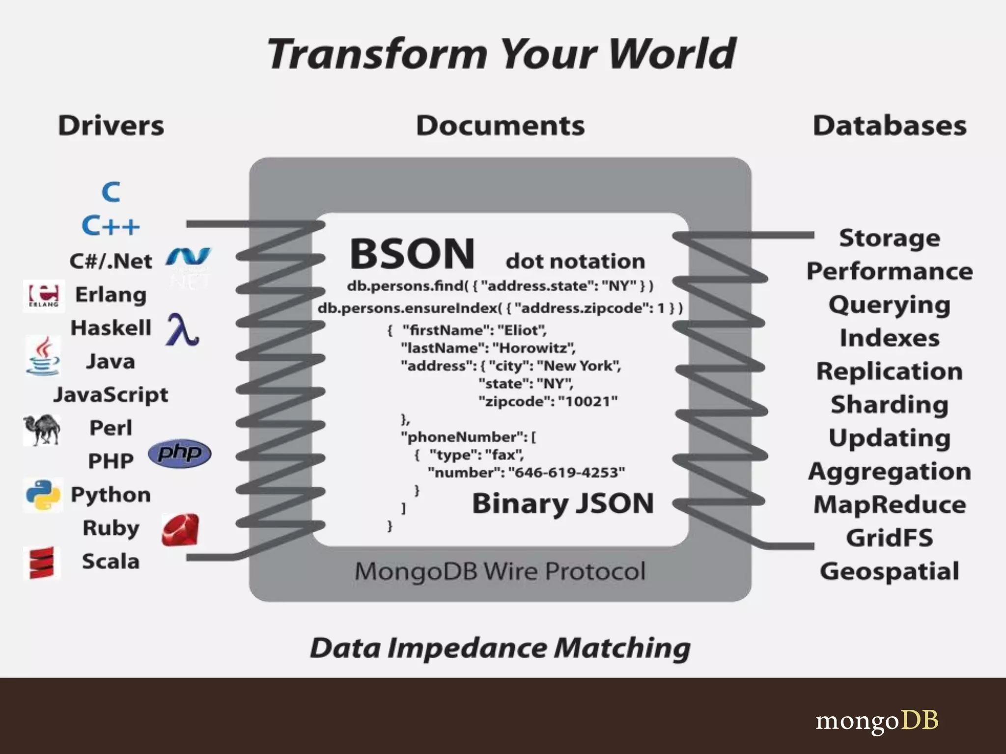 – BSON (Binary JSON) document ops are easy for the