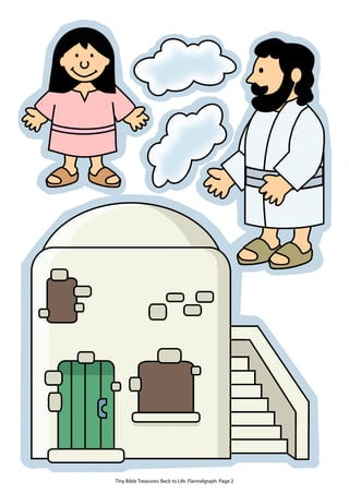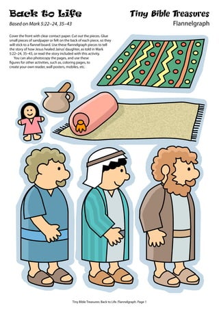 This document provides instructions and materials for a flannelgraph activity retelling the biblical story of Jesus healing Jairus' daughter based on Mark 5:22-24, 35-43. It includes pages with cut-out figures of characters from the story like Jesus, Jairus, Jairus' daughter, and disciples. The instructions explain how to prepare the pieces so they will stick to a flannel board and can be used to tell the story or for other activities like coloring pages. It also includes the story text for reference.