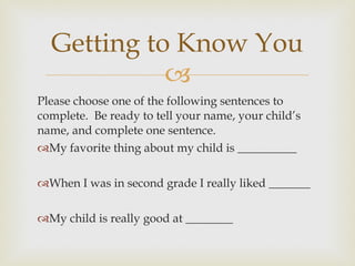 This document provides an overview of the classroom schedule, rules, standards, report cards, homework, field trips, and family nights for a second grade class. It outlines the daily schedule including times for snack, lunch, recess. It discusses classroom rules focusing on respect, responsibility and safety. It also lists the state standards that will be covered in subjects like language arts, math, science, and social studies.
