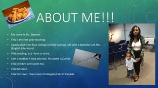 This document provides an overview of the upcoming school year for Ms. Stewart's 8th grade English Language Arts class. It introduces Ms. Stewart and her background and interests. It outlines expectations for student behavior and assignments. It previews some of the novels and projects students will work on over the course of the year. Emergency procedures for the school are also reviewed. The document aims to welcome students back and get them excited about the learning they will do.