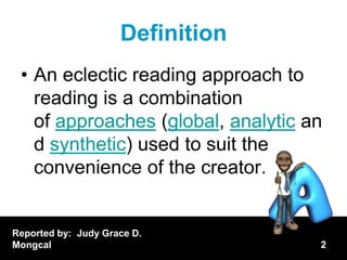 An eclectic reading approach combines different reading methods to suit the needs of the learner. The Gudschinsky instructional program is an example of an eclectic approach, developed by Sarah Gudschinsky to teach reading and writing by blending global, analytic, and synthetic reading techniques. It uses samples from literacy programs and drills to introduce literacy to preliterate societies.