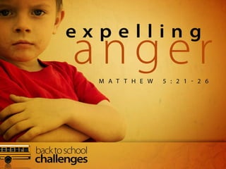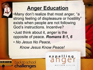 The document discusses anger and provides principles for controlling anger. It states that anger is natural but can lead to sin if not properly managed. It recommends admitting when one is angry, understanding the root causes of anger such as feeling hurt or frustrated, and resolving anger quickly before it turns to bitterness. It also suggests controlling anger by stopping to think before speaking, looking at situations from God's perspective, and listening to others rather than reacting in anger. The document provides biblical sources to back up its discussion of anger and principles for overcoming it.