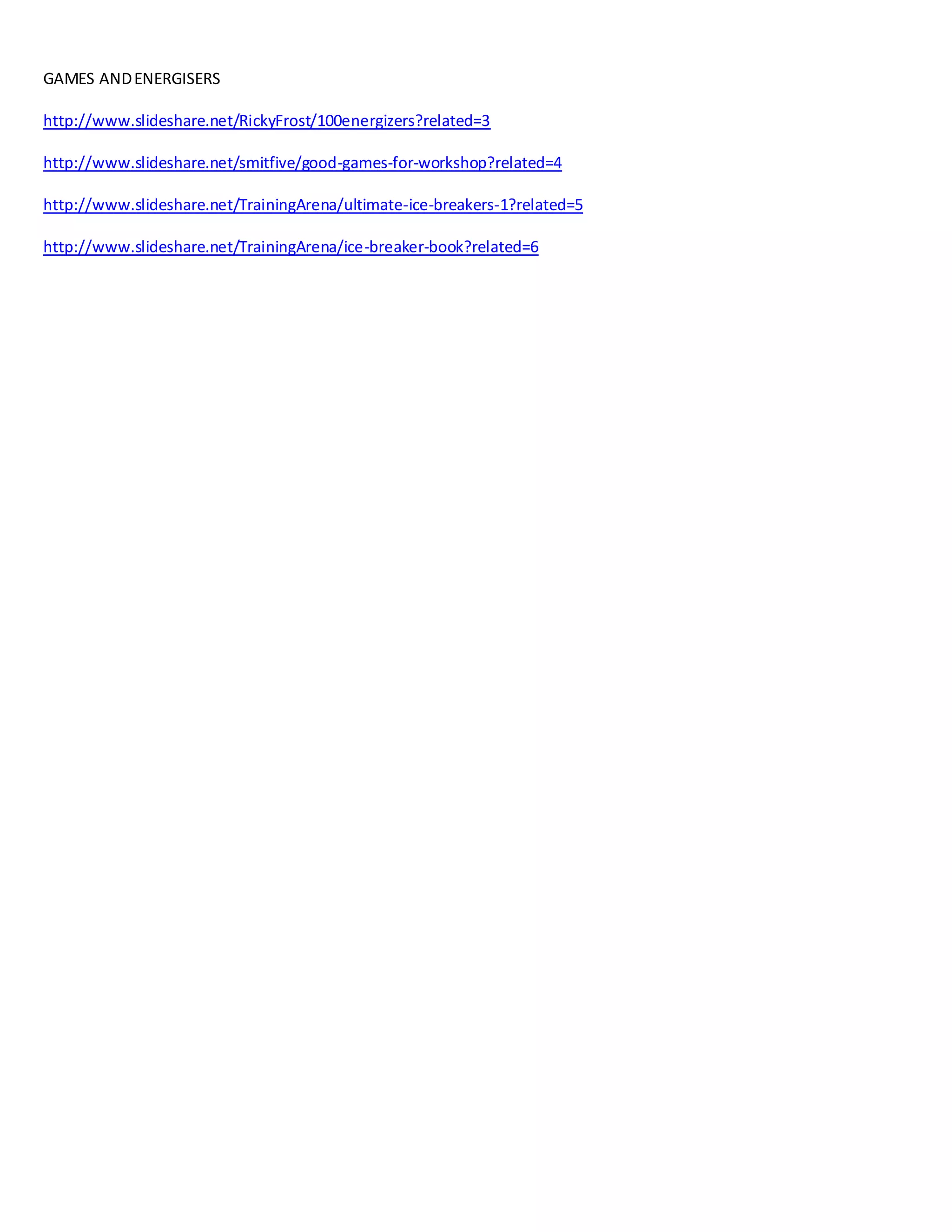This document provides links to resources on games, energizers, and icebreakers that can be used for workshops and training sessions. The first two links describe 100 energizers and good games that can be used in workshops. The third and fourth links outline ultimate icebreakers and an entire book focused on icebreaker activities to engage participants.