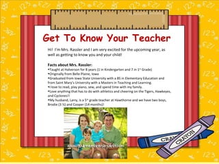 Mrs. Rassler introduces herself as the first grade teacher. She has 8 years of teaching experience and enjoys reading, music, and spending time with her family. She outlines several classroom policies including arrival/dismissal times, homework which focuses on reading daily, and her contact information. The daily schedule includes morning meeting, reading, math, science, and writing lessons.