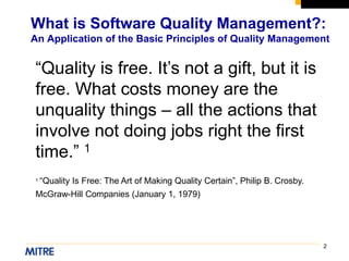 Rick Spiewak presented at the 2012 Better Software Conference East on applying basic principles of quality management to software development. He discussed defining quality as meeting requirements rather than exceeding expectations. Spiewak advocated fixing problems early in the development process and identifying and addressing the root causes of defects. He argued for establishing industry standards and best practices for software development similar to building codes for construction. Following the examples set by pioneers in software quality can help improve products and lower costs by requiring the use of best practices.