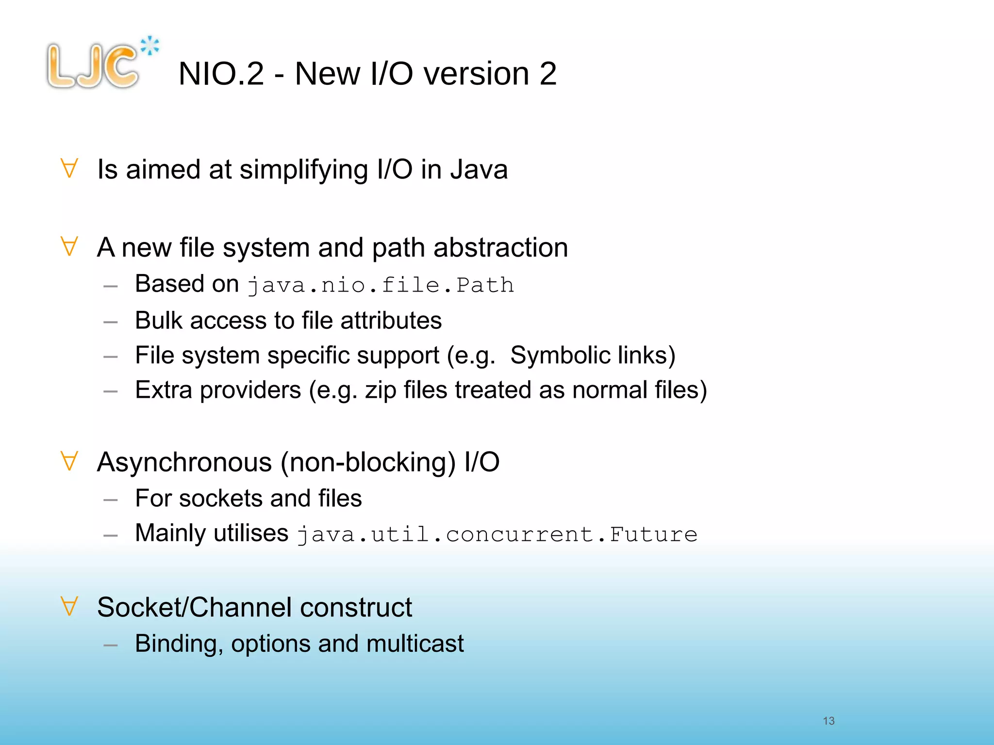 The document discusses NIO.2, a new input/output API in Java 7 aimed at simplifying file and socket operations. It introduces a new file system and path abstraction, enabling easier file manipulation and asynchronous I/O capabilities. Key features include bulk access to file attributes, path normalization, and streamlined file operations such as copying, moving, and deleting files.