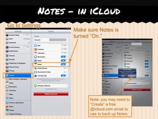 This document provides instructions for backing up notes, files, and work from an iPad mini to iCloud and Google Drive before turning in the device. It outlines how to backup notes from the Notes, Pages, Keynote, Numbers, and Notability apps. For each app, the user is instructed to ensure the iCloud or Google Drive setting is turned on to automatically upload files. It emphasizes that backing up files is the user's responsibility and that they should verify they can access backed up files from other devices.