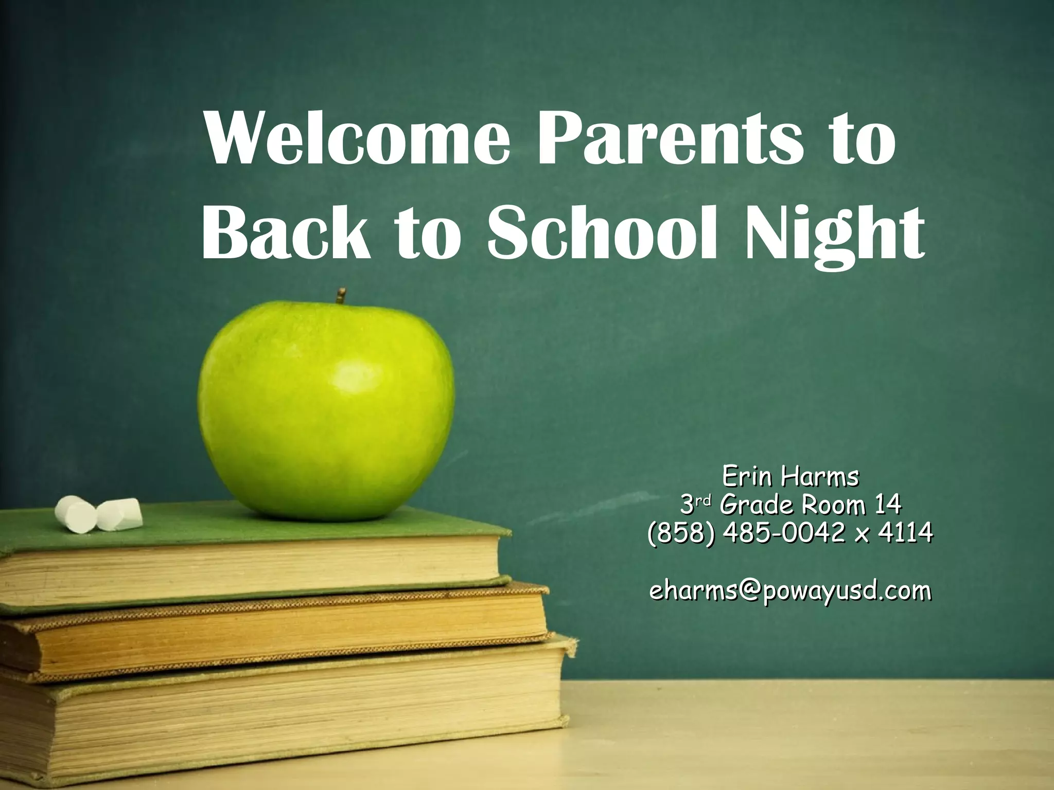 Erin Harms is a 3rd grade teacher at Poway Unified School District. She provides an overview of her background and experience, as well as details about her classroom schedule, curriculum, homework policies, communication methods, and opportunities for parents to volunteer or donate. She emphasizes the importance of parental involvement and a team approach between home and school for students to succeed.