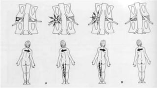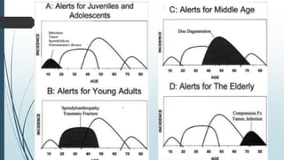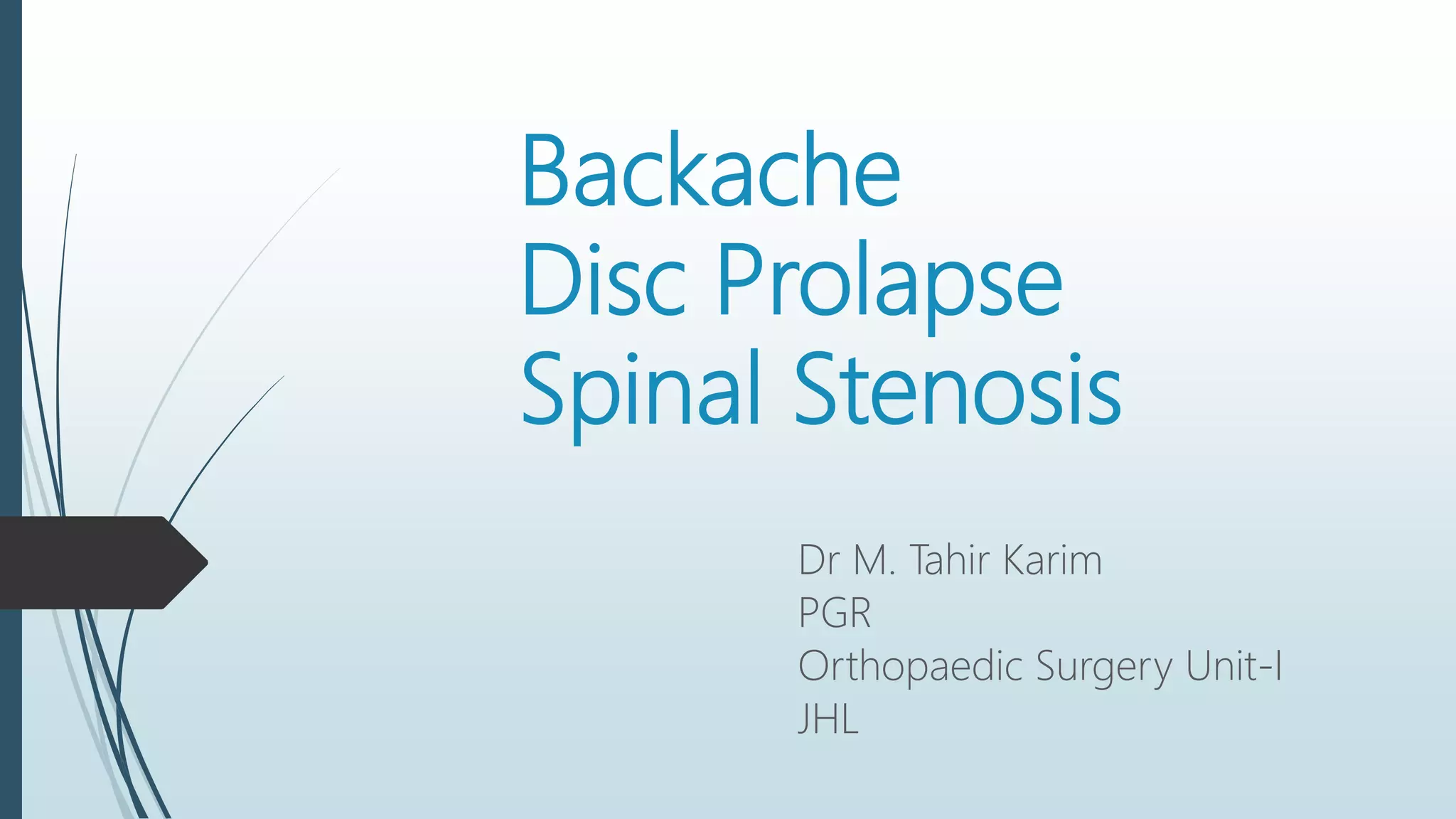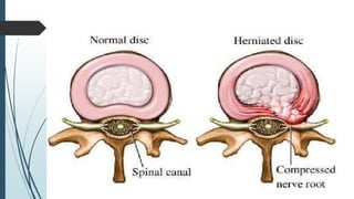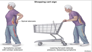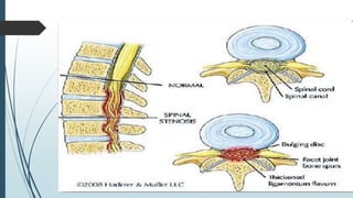 The document discusses lower back pain and associated conditions such as disc prolapse and spinal stenosis, detailing their causes, clinical features, risk factors, examination methods, diagnostic procedures, and treatment options. It highlights the high prevalence of lower back pain, noting mechanical and neurogenic causes, and emphasizes the need for proper examination and imaging to differentiate between serious underlying issues and non-specific pain. Treatment strategies include conservative approaches like medication and physical therapy, as well as surgical interventions when warranted.