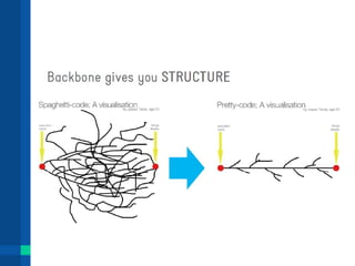 Backbone.js is a JavaScript MVC framework that provides structure to web applications. It includes models to represent and persist data, collections to store and enumerate models, views to manipulate the DOM based on models/collections, and connects it all through a RESTful JSON API. The framework aims to abstract away complexity, decouple UI from data, and avoid callback hell. Examples show how models represent data, collections store models, and views tie them together through the DOM.