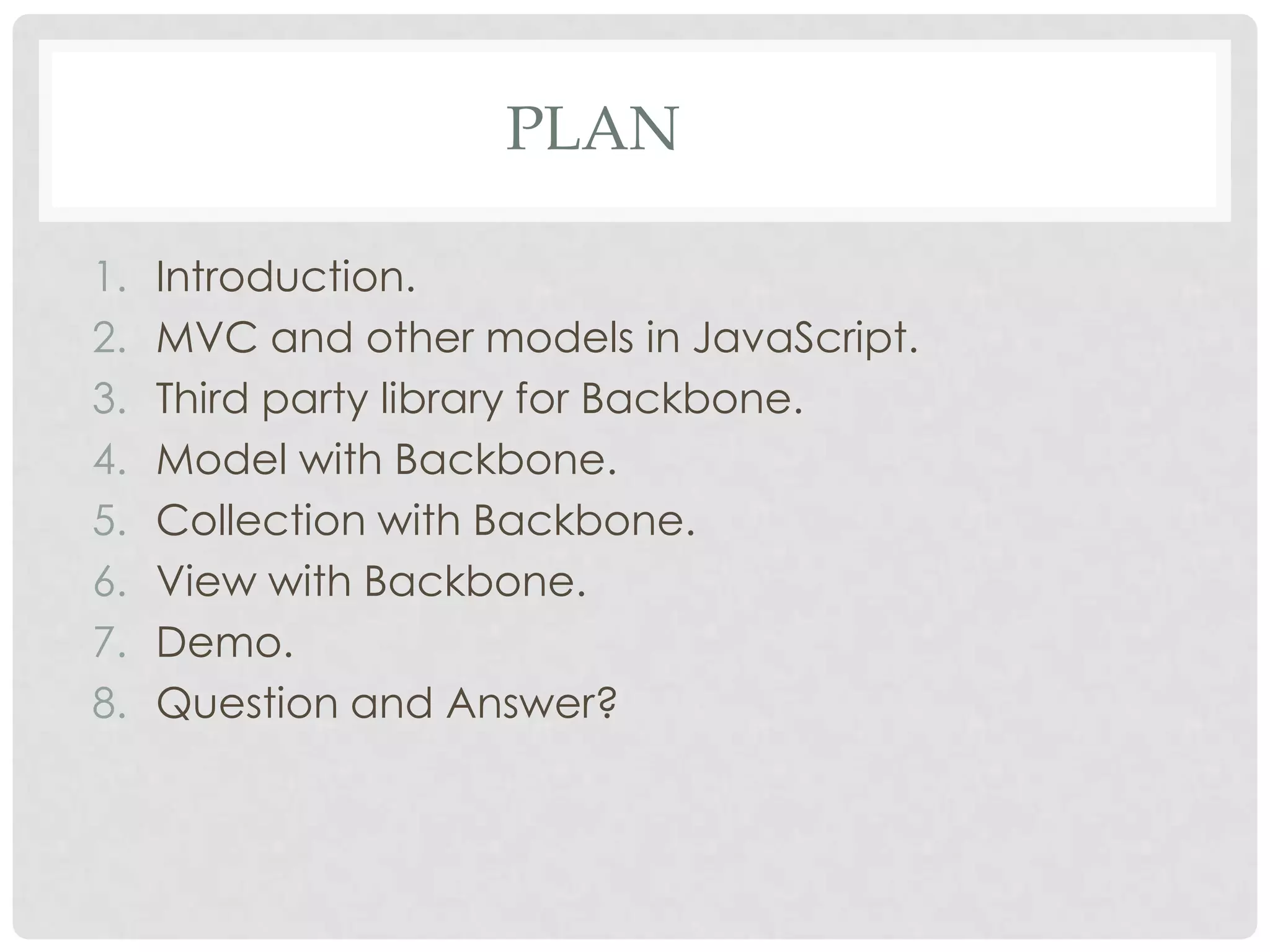 This document outlines a plan to introduce the Backbone.js JavaScript framework. It begins with an introduction to MVC and other models in JavaScript. It then discusses third party libraries that can be used with Backbone like jQuery. The rest of the document details the core components of Backbone - Models, Collections, Views and controllers. It provides examples of implementing each component and discusses benefits like easier maintenance and decoupling of logic from the user interface.