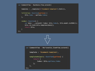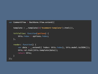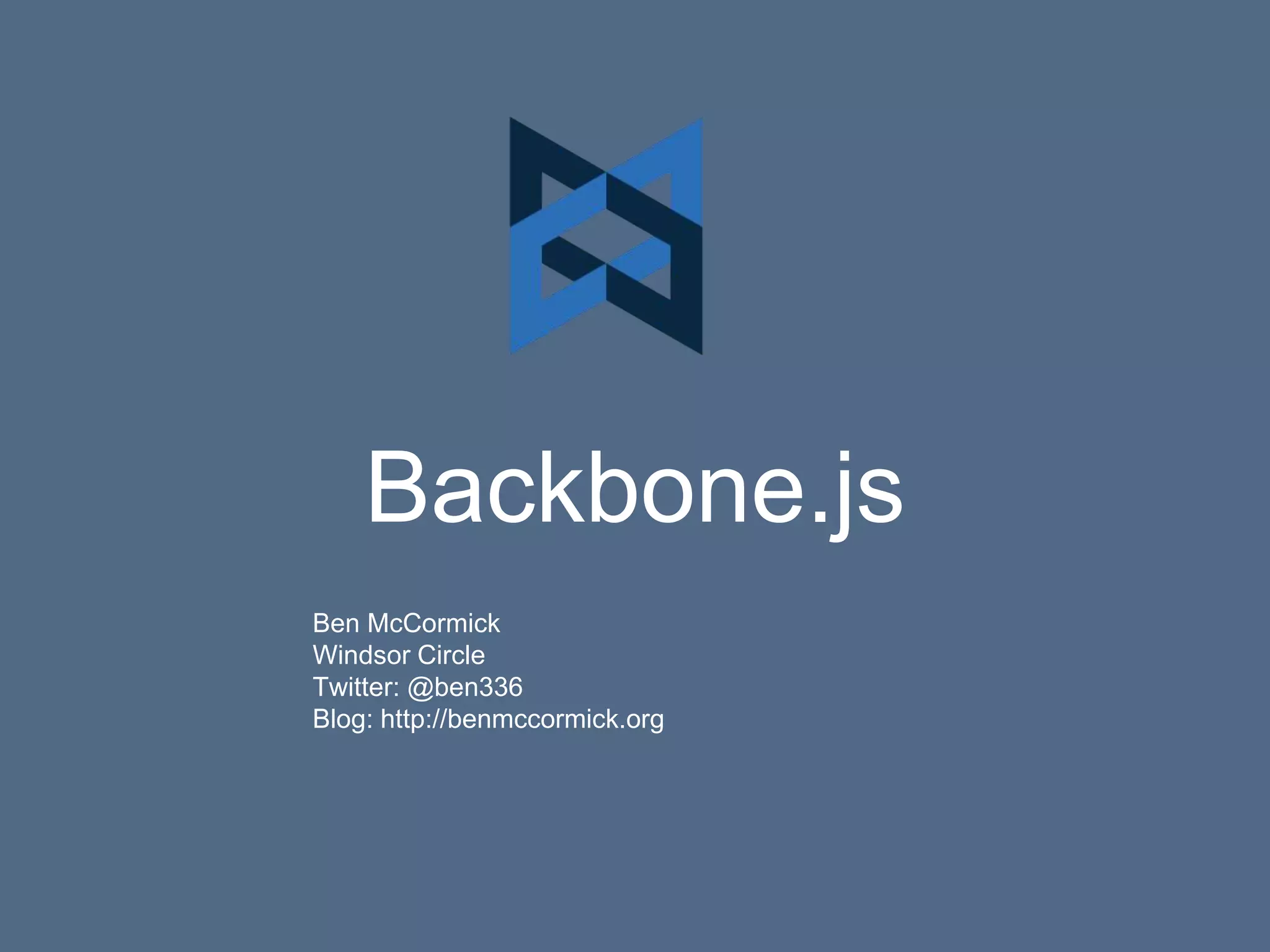 Ben McCormick will give a presentation on Backbone.js. He has over a year of experience using Backbone and experience with alternatives like React, Angular, and Knockout. He will explain what Backbone is, why it remains relevant despite newer frameworks, and provide demonstrations. Backbone is a lightweight client-side JavaScript framework that provides models, collections, views, and routing capabilities. It emphasizes separation of data and views, extensibility, minimalism, and transparency. These principles allow for flexibility, usability, fast learning, and stability over time as technologies evolve.