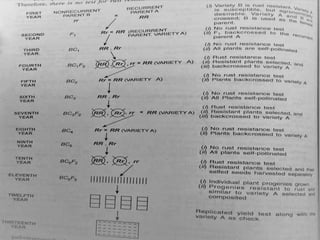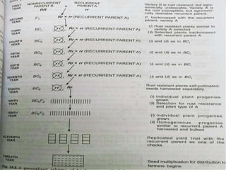 The document describes the backcross method for transferring genes between plant varieties. It discusses how the backcross method can be used to transfer both dominant and recessive genes. It defines recurrent and non-recurrent parents, and explains that the objective is to transfer one or two traits from the non-recurrent parent into the recurrent parent. Over multiple backcrosses, the genotype of the recurrent parent is recovered while retaining the desired trait. Examples are given of diseases resistance being transferred between wheat and cotton varieties using this method.