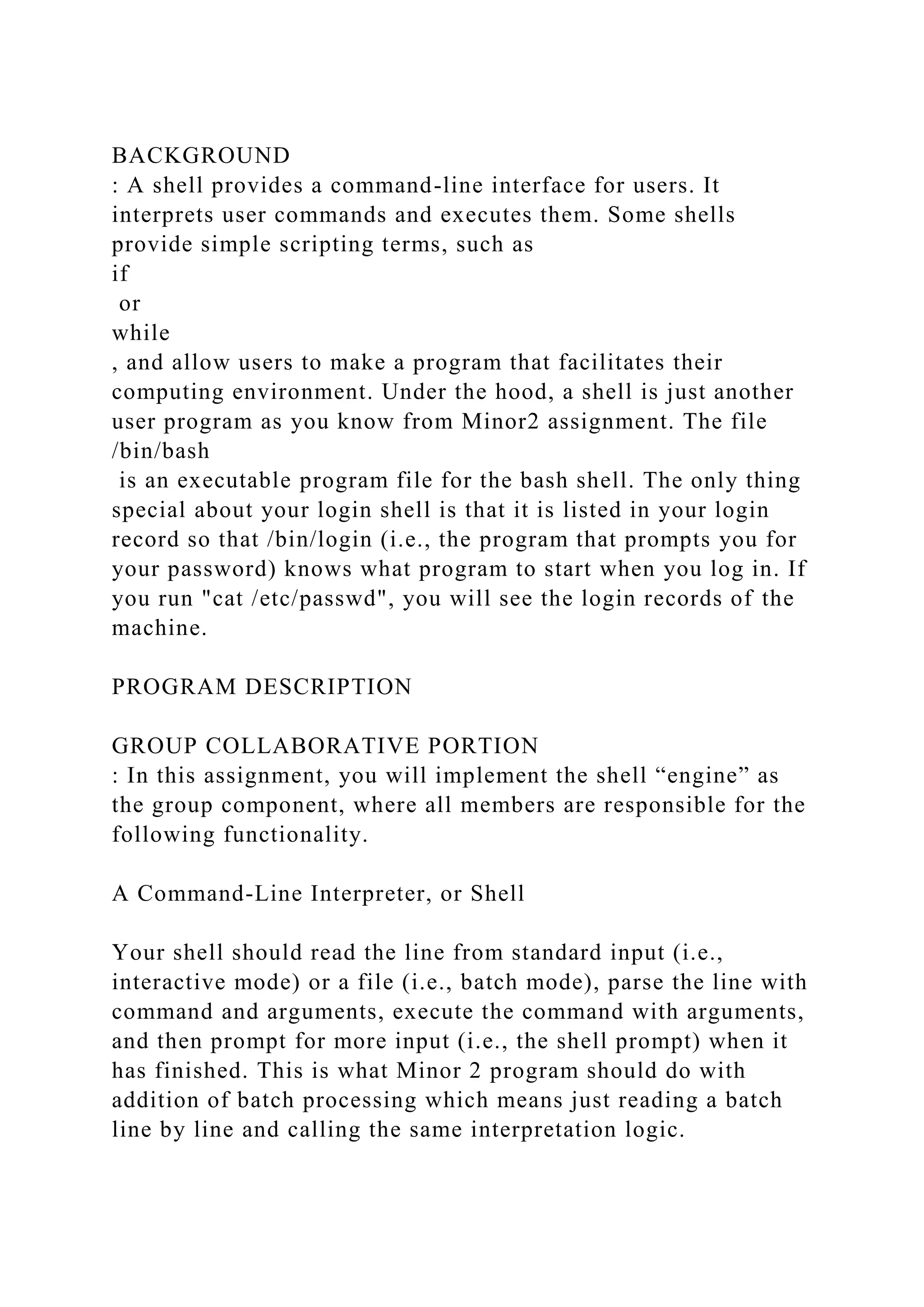 The document outlines the implementation of a command-line shell program as a group assignment, detailing its functionality in both interactive and batch modes. It requires the use of system calls, support for built-in commands like alias, exit, path, and history, while ensuring that it handles errors properly. Additionally, students must document their code and provide a README in a specified format, with grading based on correctness and project organization.