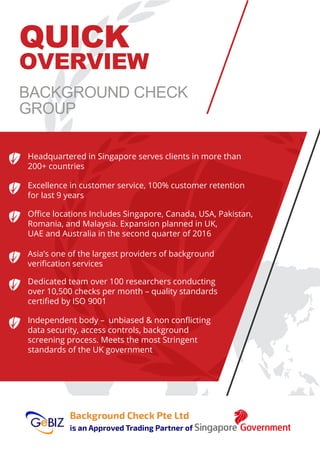 Background Check Group, headquartered in Singapore, provides background verification services in over 200 countries, with a strong retention rate and expansion plans. The company offers a range of solutions, including due diligence, talent management, and training services, leveraging advanced technology to ensure compliance and quality. With extensive experience and a focus on background screening, it serves global clients and has a strong local presence in Pakistan among other regions.