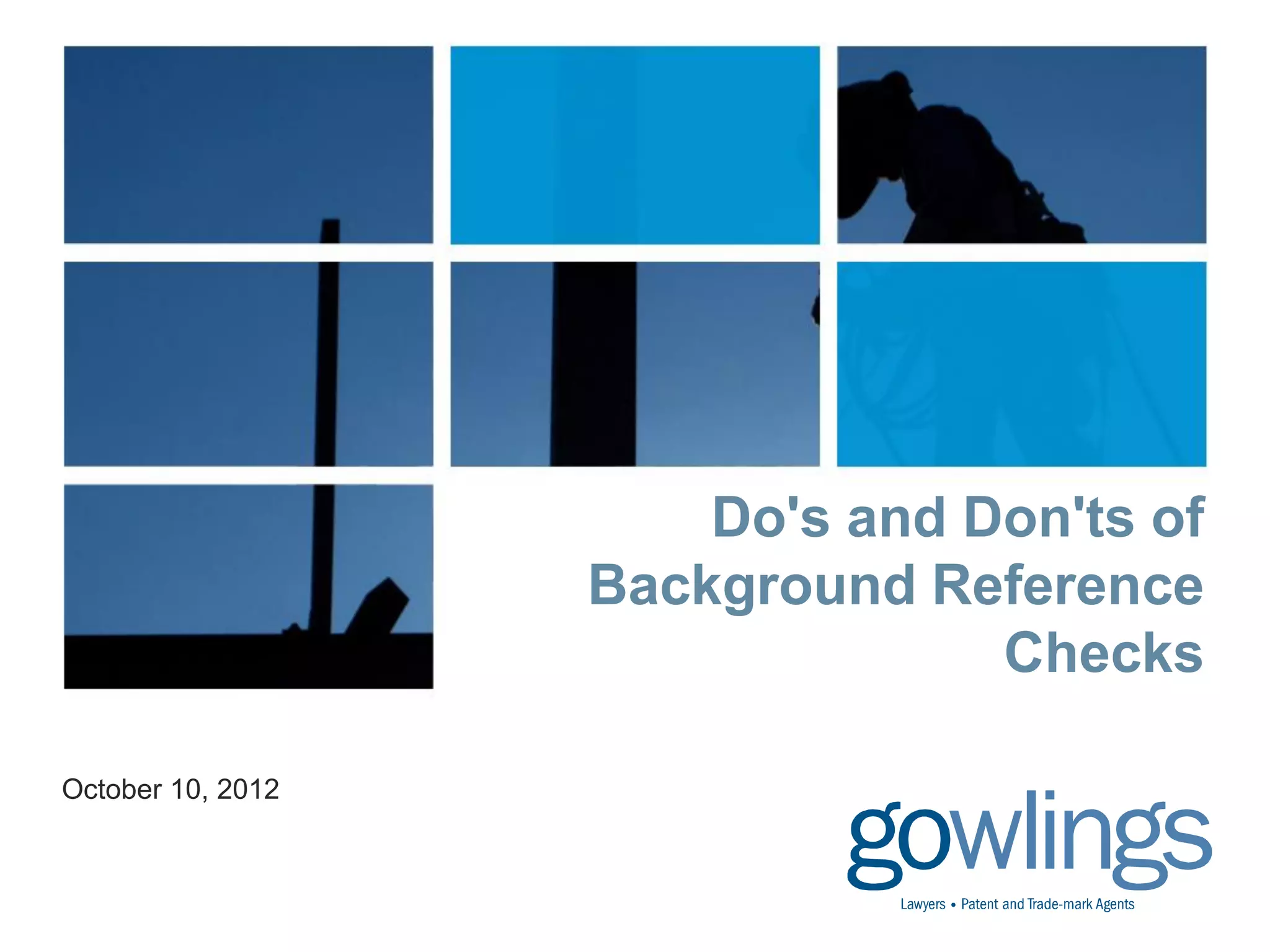 The document provides an overview of background reference checks and discusses various types including criminal records checks, credit checks, reference checks, driver's record checks, and social media checks. It outlines the process and best practices for properly conducting each type of check in accordance with relevant privacy and human rights legislation to avoid potential liability. Key recommendations include obtaining proper consent, only collecting necessary information, keeping information confidential, and being careful not to rely on protected characteristics.