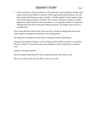 This document provides background information on Sasami, a 3rd level monk NPC, for the Game Master. It reveals that Sasami survived a terrible accident as a toddler when the goddess Tsunami took pity on her and placed the life force of a lesser angel within her. As a result, Sasami has abilities similar to a Type I angel such as detecting good/evil, creating light, and radiating protection from evil. The document compares Type I demons and angels and provides stats for each. It also notes Sasami has precognitive dreams and is an excellent cook.