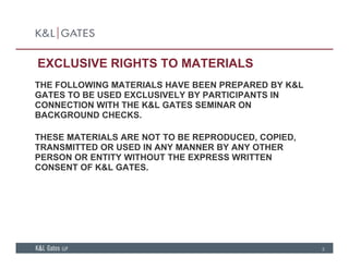 The document discusses legal requirements, pitfalls, and considerations regarding background checks in employment. It covers state and federal laws governing what types of background information can be obtained and used in making hiring and other employment decisions. Key restrictions covered include limitations on obtaining and using criminal history information, credit reports, polygraph tests, and fingerprints. The document also outlines requirements for using consumer reports and investigative consumer reports in compliance with California and federal law.