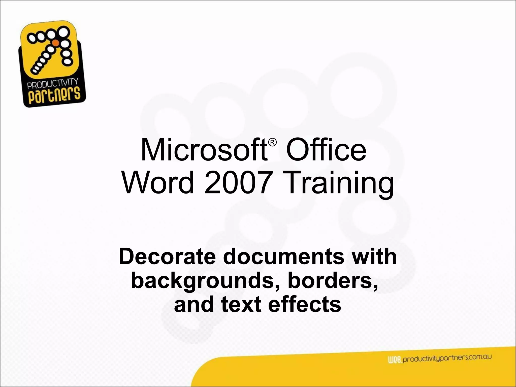 This document provides a training course on using decorative elements in Microsoft Word 2007 to make documents less plain.