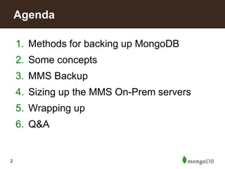 The document discusses backing up MongoDB data with MongoDB Management Service (MMS). MMS allows for backing up to the cloud or on-premises. It offers simple, automated backups with point-in-time restore capabilities. The backups are configurable in terms of frequency, retention period, and restore options. MMS supports backing up replica sets and sharded clusters to ensure consistent snapshots of the data.