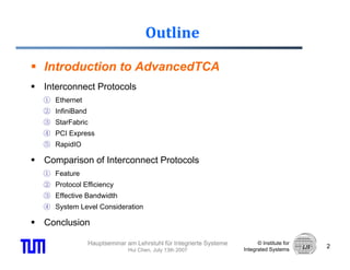 This document provides an overview of backplane technologies for AdvancedTCA systems. It introduces AdvancedTCA and describes its chassis and board specifications. Five interconnect protocols - Ethernet, InfiniBand, StarFabric, PCI Express, and RapidIO - are then summarized in terms of their features, topologies, packet formats, and support for quality of service. The document concludes with a comparison of these protocols on various characteristics.