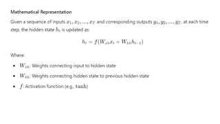 Backpropagation through time (BPTT) is an adaptation of the standard backpropagation algorithm used for training recurrent neural networks (RNNs) by unrolling the RNN across time steps to compute gradients for weight updates. Key challenges include vanishing and exploding gradients, which affect learning dependencies in long sequences, and high computational complexity due to storing hidden states. Strategies like truncated BPTT, gradient clipping, and the use of LSTMs and GRUs help address these challenges.
