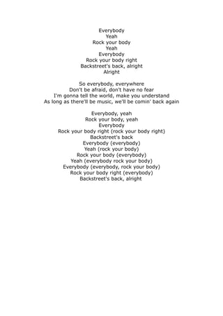 The song encourages everyone to rock their body to the music of Backstreet Boys, who declare that they are back again with their signature sound. It asks a series of rhetorical questions to assert that the band is original, unique, and everything their fans need. The lyrics tell listeners to not be afraid and that as long as there is music, Backstreet Boys will keep performing and coming back for their fans.