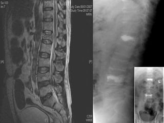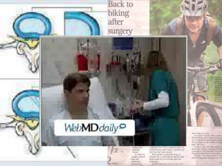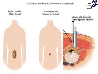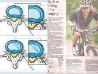 This document discusses maintaining proper posture to prevent back pain and injury. It recommends sitting with neutral spine alignment, either by sitting forward on the chair without back support or leaning back with back support. Certain postures can increase back injury risk factors. The document also mentions biopsy procedures for cancer diagnosis and treatment options for back pain including physical therapy, injections, and surgery, noting minimally invasive surgeries have benefits like better patient outcomes, lower costs, shorter hospital stays and recovery times, and less invasiveness especially for the elderly.