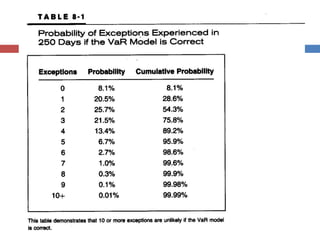 The document discusses Value-at-Risk (VaR) models and backtesting methods used to evaluate VaR estimates. Backtesting compares predicted VaR losses to actual losses to identify instances where VaR was underestimated. The results can refine VaR models to improve accuracy and reduce unexpected losses. Proper backtesting assesses whether exceedance frequencies match confidence levels and whether results appear independent over time.