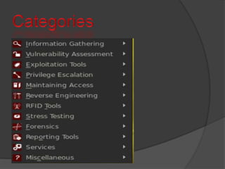 Group 02 presents on Kali Linux, a Linux distribution designed for digital forensics and penetration testing. Kali is the successor to Backtrack and contains many preinstalled security tools. It has advantages over other platforms for its large number of available tools, ease of use through Ubuntu and a GUI, and compiled toolkit with fewer client dependencies.