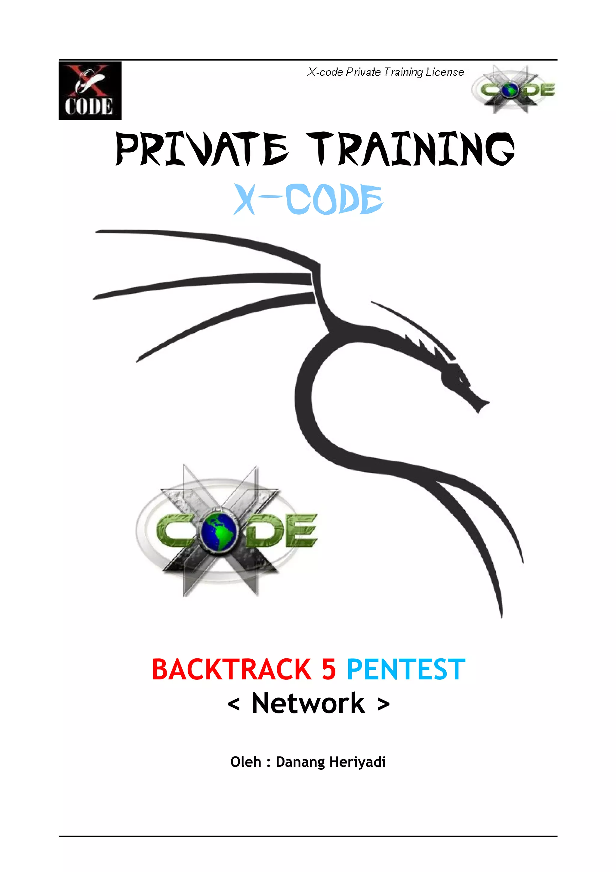 Dokumen ini merupakan panduan lengkap tentang pelatihan penggunaan Backtrack 5 untuk penetrasi keamanan jaringan. Berisi pengantar, instalasi, dasar penggunaan, metode pengumpulan informasi, penilaian kerentanan, dan teknik serangan. Selain itu, dokumen ini juga membahas tentang penggunaan berbagai alat keamanan yang tersedia dalam Backtrack.