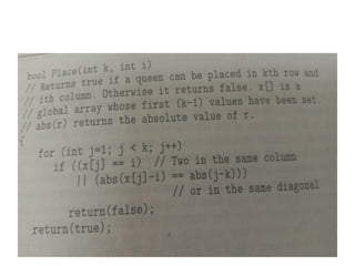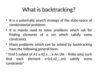 Backtracking is a systematic search strategy for solving combinatorial problems by finding subsets of elements that meet specific constraints. It constructs a state space tree where each node represents partial solutions, evaluating if they are promising or lead to conflicts. Key problems solved using backtracking include the n-queens problem, Hamiltonian circuit, and subset-sum problem.