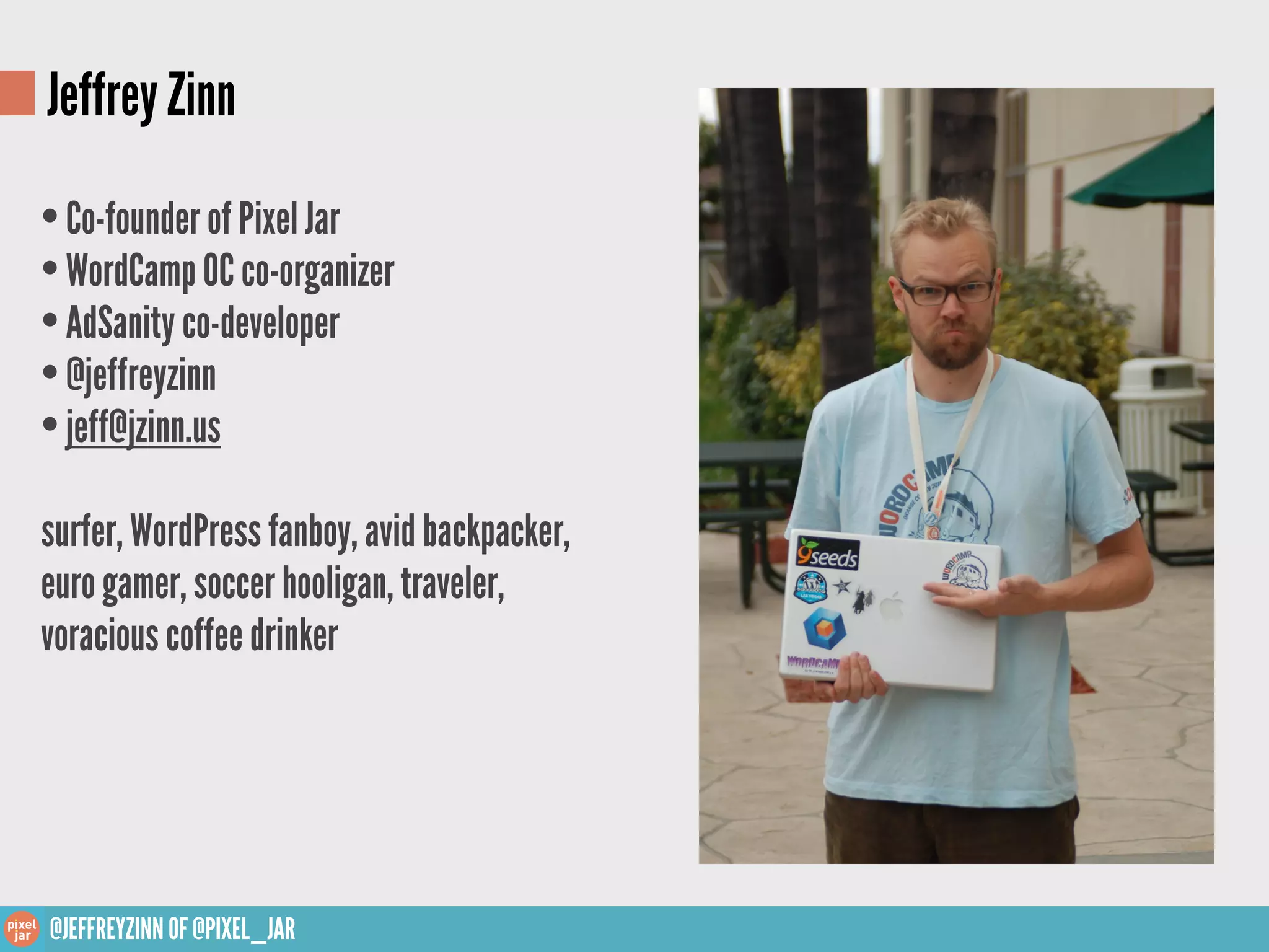 Jeffrey Zinn presented on backup and security for WordPress sites. He outlined that the objectives are to reduce risk of being hacked and have a plan for if hacked. He recommended securing computers, connections, and WordPress sites through updates and strong passwords. For backups, he said to back up the database and files, do so frequently in multiple locations, and provided options for manual, plugin-based, third party, and specialized hosting backups. The presentation emphasized having a backup plan is essential for disaster recovery.