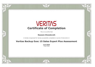 This certificate certifies that Naseem Khoodoruth completed a course in Veritas Backup Exec 15 Sales Expert Plus Assessment on December 4, 2015. The certificate recognizes Naseem Khoodoruth for successfully finishing instruction in Veritas Backup Exec 15 Sales Expert Plus Assessment on that date.