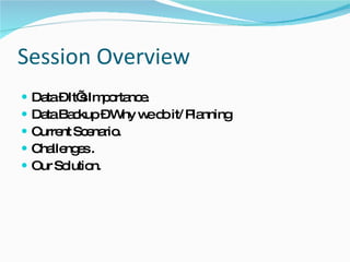 The document discusses the importance of data backups for businesses. It notes that most businesses do not carry out daily backups and many backups are incomplete. Without proper backups, businesses risk data loss from hardware failures, viruses, fires or floods which could cause severe business disruptions or failure. The document recommends developing a formal backup policy and using backup software to regularly and reliably back up data from servers, desktops and laptops across an organization.