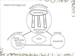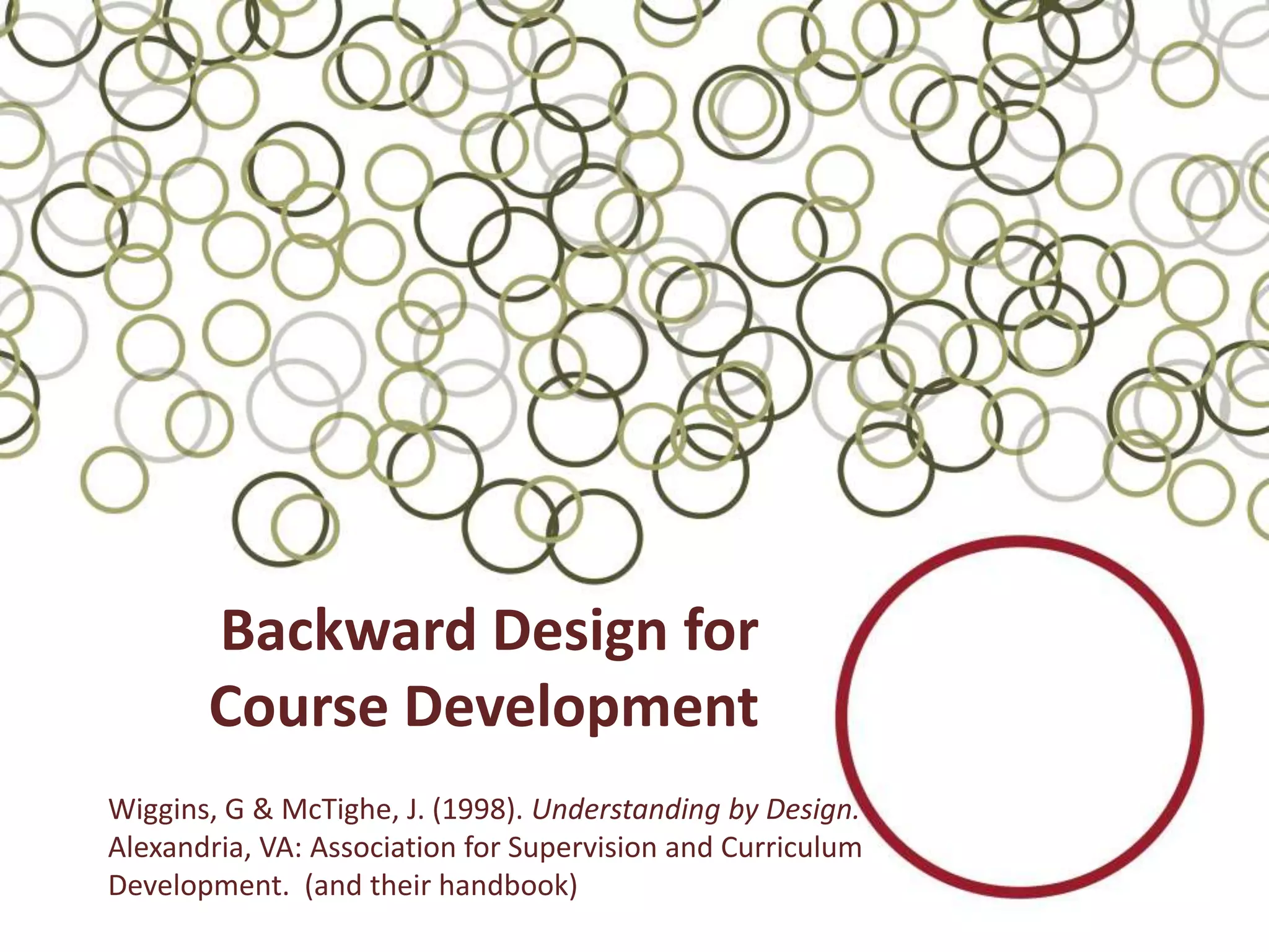The document outlines the key principles of backward design for course development. [1] It discusses identifying desired results by focusing on important understandings, knowledge, and skills students should develop. [2] It emphasizes determining acceptable evidence for assessing student understanding through authentic tasks and varying assessments. [3] It addresses planning learning experiences and instruction by considering what students need to learn and how to teach it to achieve the desired results.