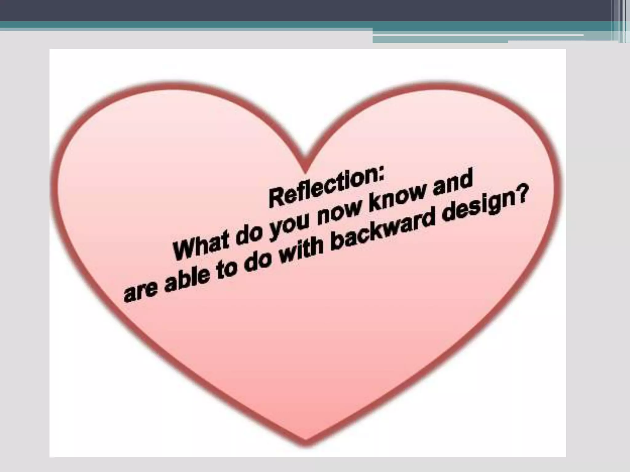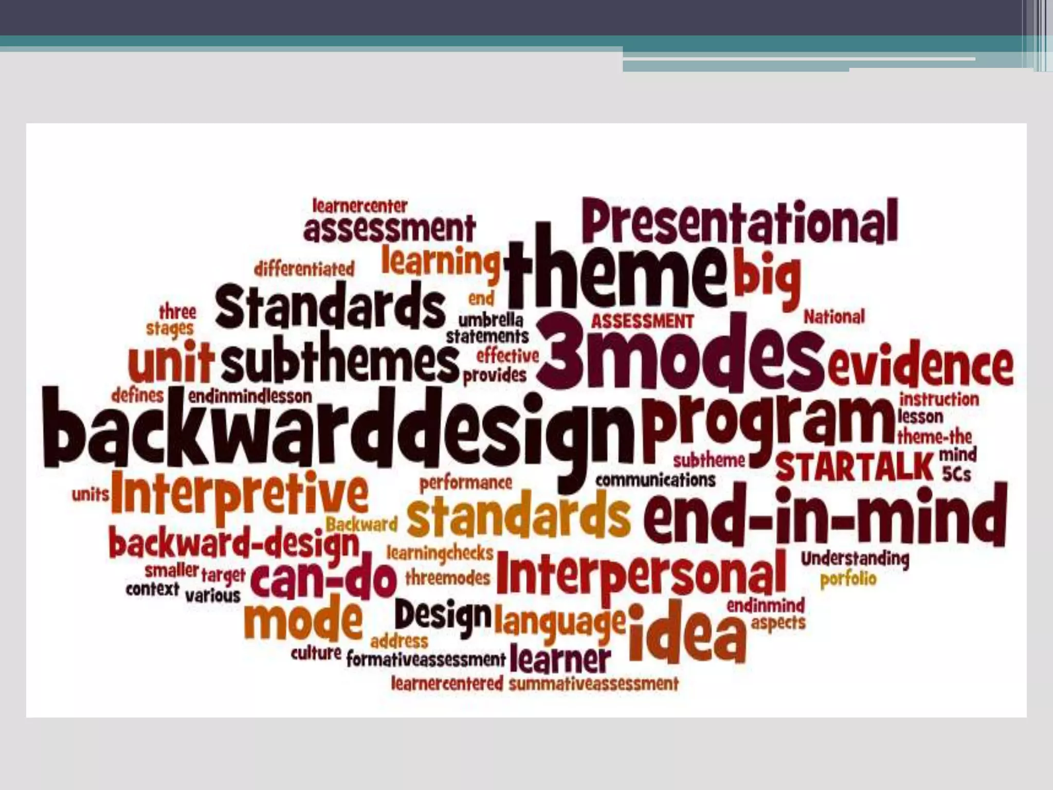 The document discusses the principles of backward design for creating student-centered thematic units. Backward design is a framework that involves starting with the desired learning outcomes and goals, then designing assessments to measure those outcomes, and finally developing instructional activities to help students achieve the outcomes. The document provides information on the three stages of backward design: 1) identifying desired results like standards and objectives, 2) determining acceptable evidence of student learning through assessment, and 3) developing learning plans and instruction. It also discusses how to design thematic units around key concepts and aligned assessments using this approach.