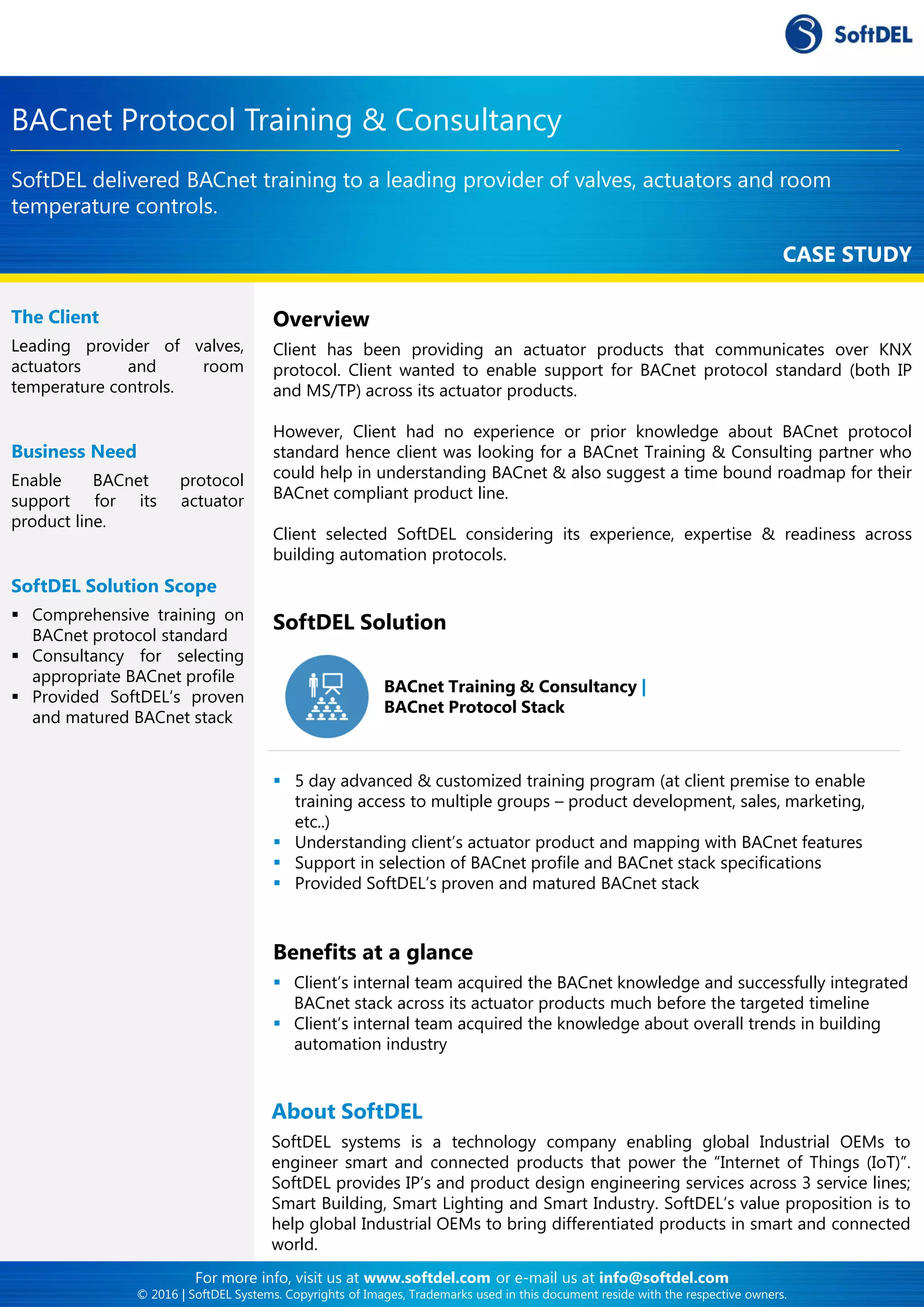 Softdel provided BACnet training and consulting to a leading actuator products provider seeking to enable BACnet protocol support for its product line. The client, lacking prior knowledge of BACnet, selected Softdel for its expertise to guide them through the integration process, leading to successful implementation ahead of schedule. The training program included a customized five-day course covering BACnet protocol standards, mapping the client’s products, and providing a proven BACnet stack.