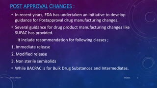 The document is a presentation on post-approval changes to bulk active chemicals. It discusses FDA guidance called BACPAC (Bulk Active Chemicals & Post Approval Changes) which provides recommendations for post-approval changes to drug substance synthesis, including site, scale and equipment changes as well as specification and manufacturing process changes. The guidance covers assessing equivalence after changes and determining the appropriate reporting category based on the potential effects of changes.